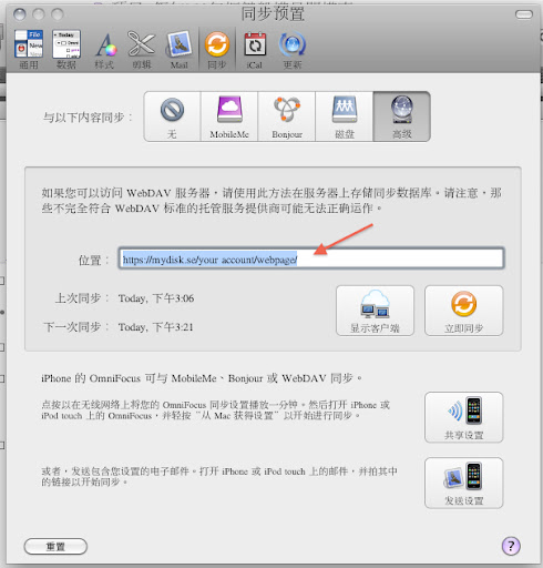 首先打開OF偏好設定,選擇“同步”頁次,再選擇“高級”,輸入“https://mydisk.se/your account/webpage/