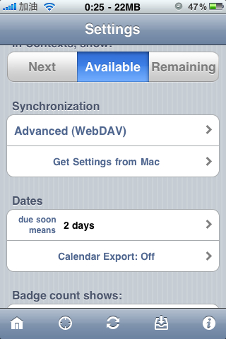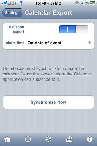 並把底下的”Dates“中的”calendar Export:off“開關設為開.再點選底下的”Synchronie Now“(此時應該顯示為”subscribe calendar“,我已設定完了,所以顯示不一樣),讓iphone上的行事曆可以加入omnifocus中的工作內容.